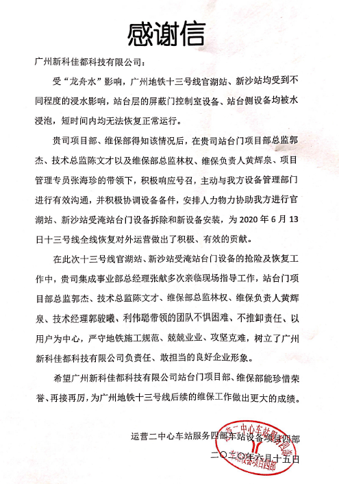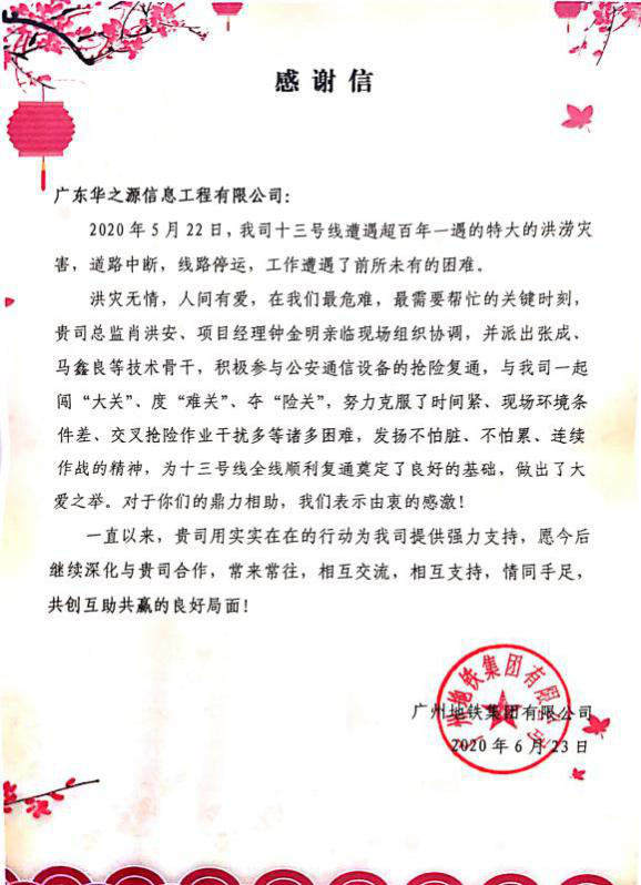 参与抢险的米兰milan科技全资子公司新科佳都和华之源被授予感谢信